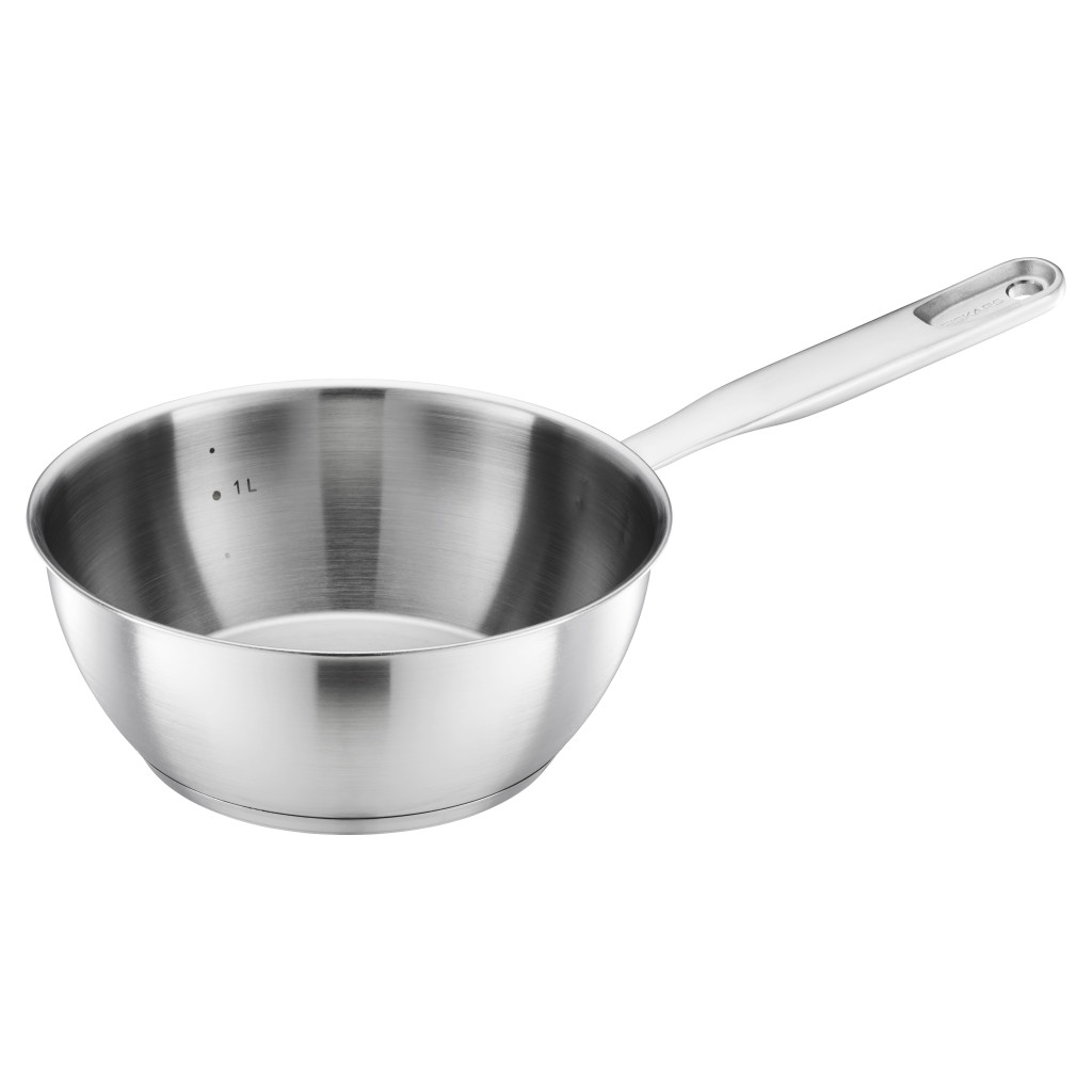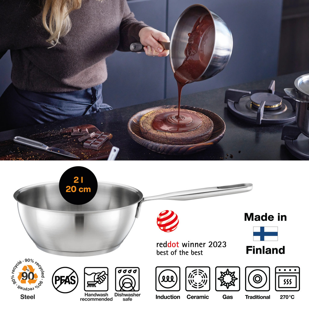 - Kiváló hőeloszlás: Vastag, háromrétegű alap biztosítja az egyenletes hőeloszlást minden típusú tűzhelyen, beleértve az indukciósat is.