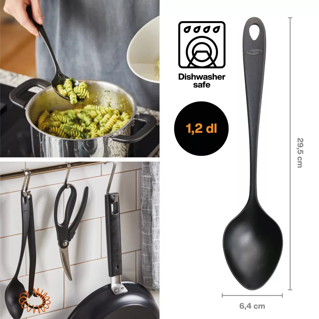 A Fiskars Essential kanál egy könnyű és praktikus konyhai eszköz, mely ideális levesekhez, szedéshez, keveréshez és áttöltéshez. A kiváló minőségű műanyagból készült, ergonomikus nyél biztosítja a kényelmes és biztonságos fogást, így a főzés egyszerűbbé és élvezetesebbé válik. Élvezze a biztonságos és helytakarékos használatot a Fiskars Essential kanállal!