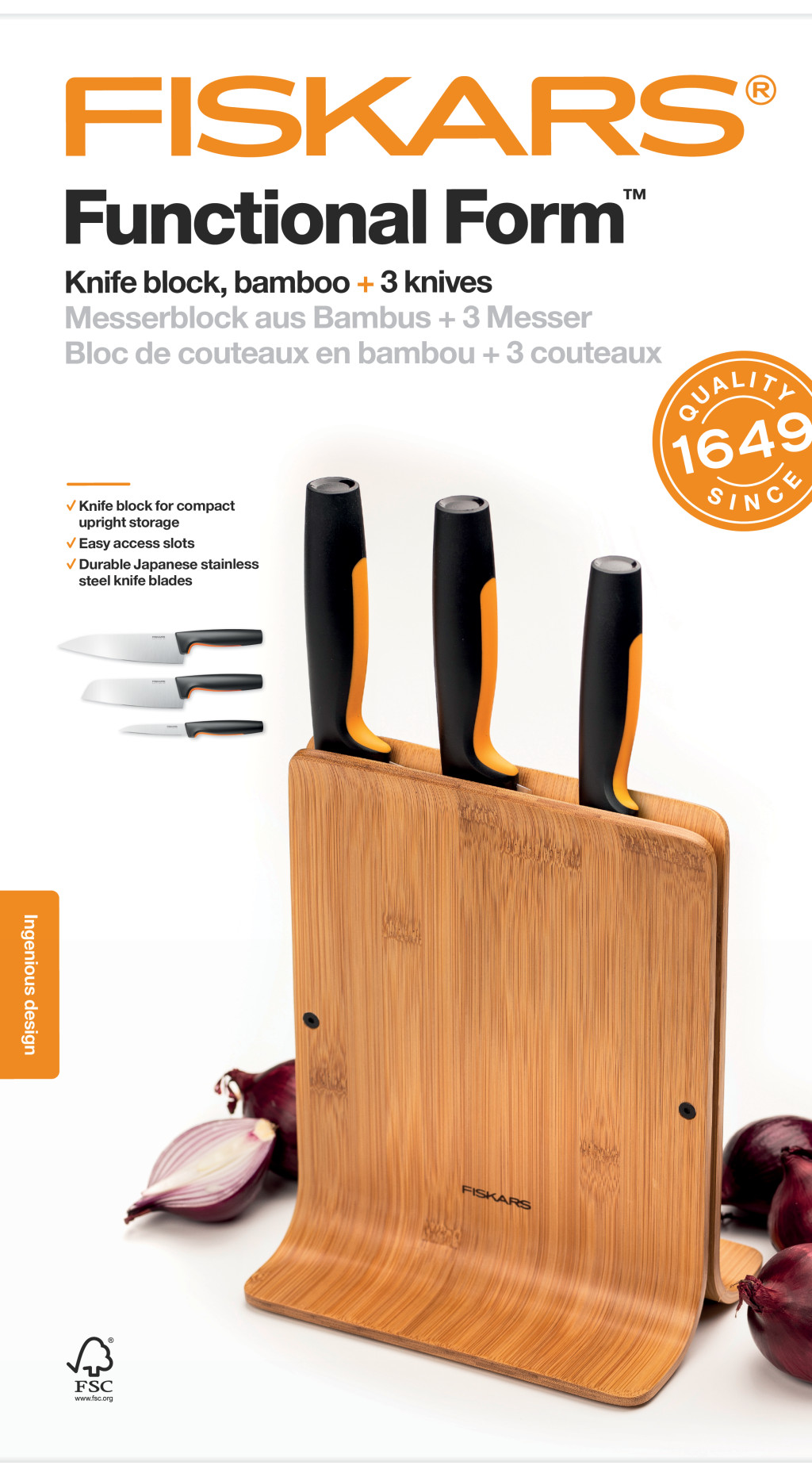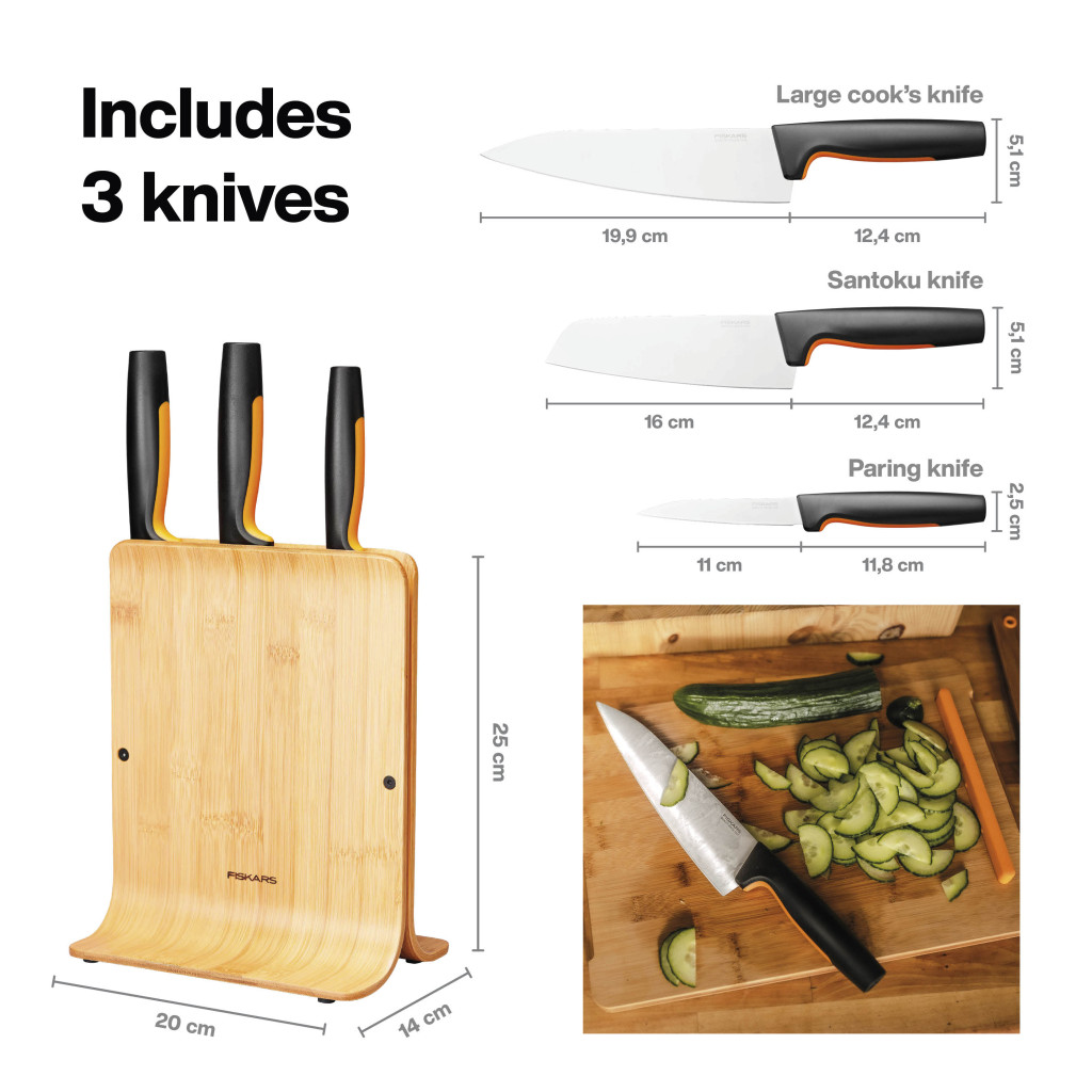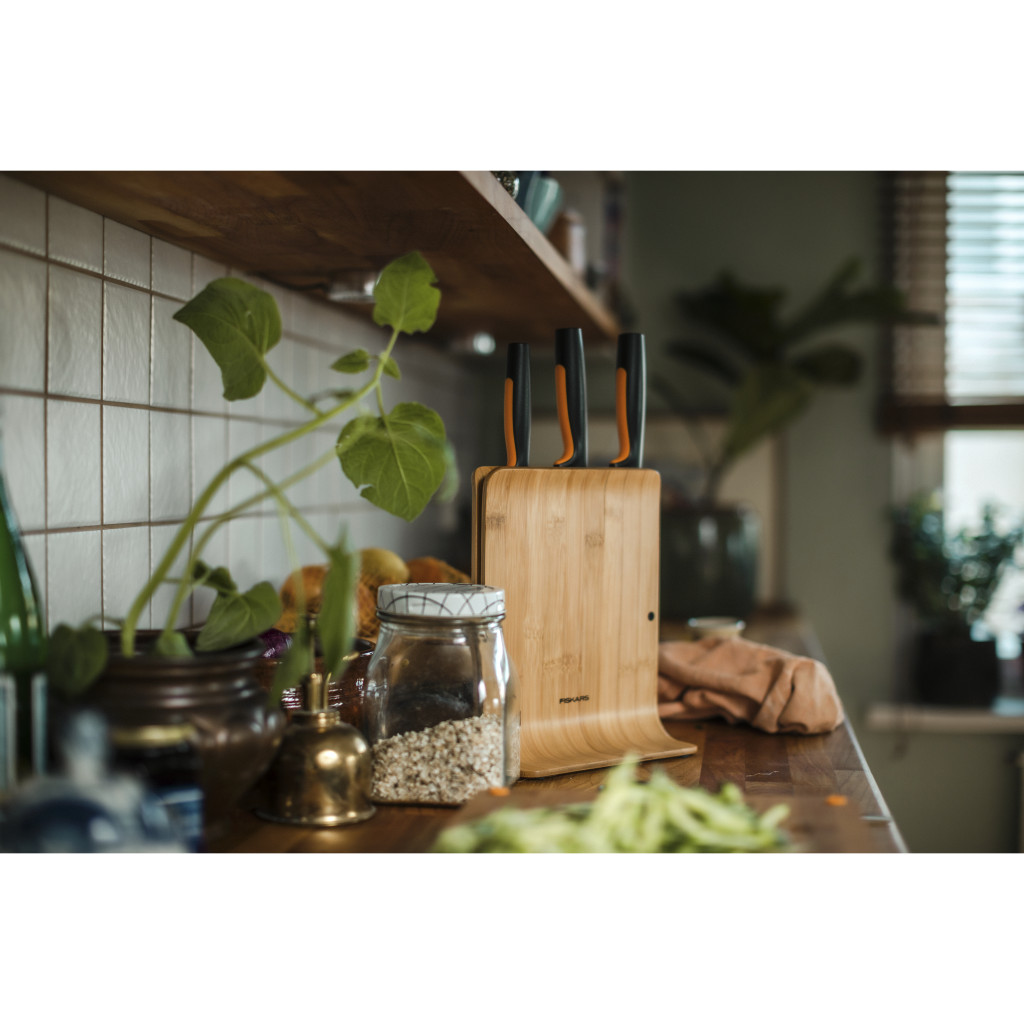 A Fiskars Functional Form bambusz késblokk 3 késsel egy innovatív és praktikus konyhai megoldás, amely a mindennapi főzés során nyújt segítséget. Ez a késblokk fenntartható FSC® minősítésű bambuszból és műanyagból készül, így környezetbarát választás azok számára, akik értékelik a környezettudatosságot.