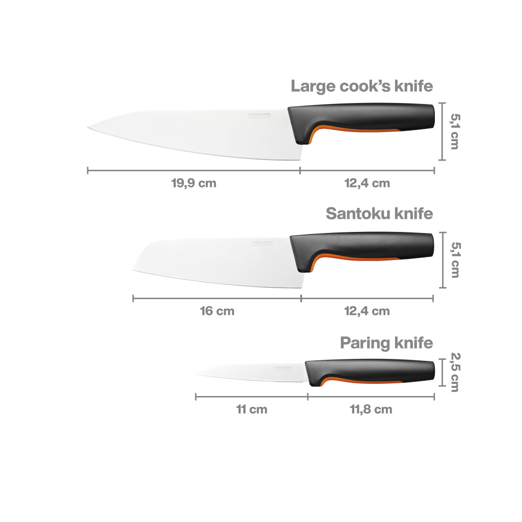 A késblokk három alapvető kést tartalmaz: egy nagy szakácskést (199 mm-es pengével), egy Santoku kést (160 mm-es pengével), és egy hámozókést (110 mm-es pengével). A késpengék tartós japán rozsdamentes acélból készülnek, míg az ergonomikus markolatok SoftGrip™ borítással és nagy ujjvédőkkel rendelkeznek, biztosítva a kényelmes és biztonságos fogást.