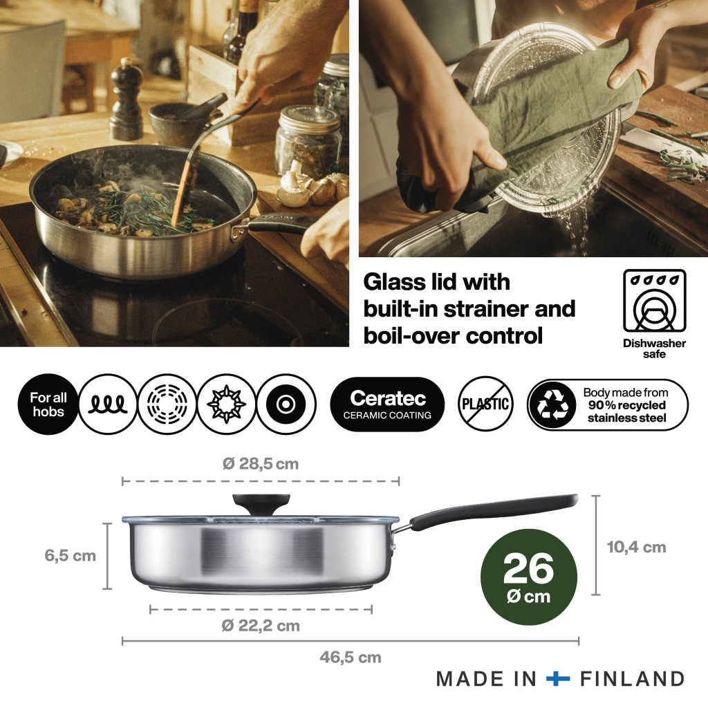A serpenyő 90%-ban újrahasznosított rozsdamentes acélból készült Finnországban, 150 °C-ig sütőálló, és minden tűzhelyen – az indukciósat is beleértve – tökéletesen működik.