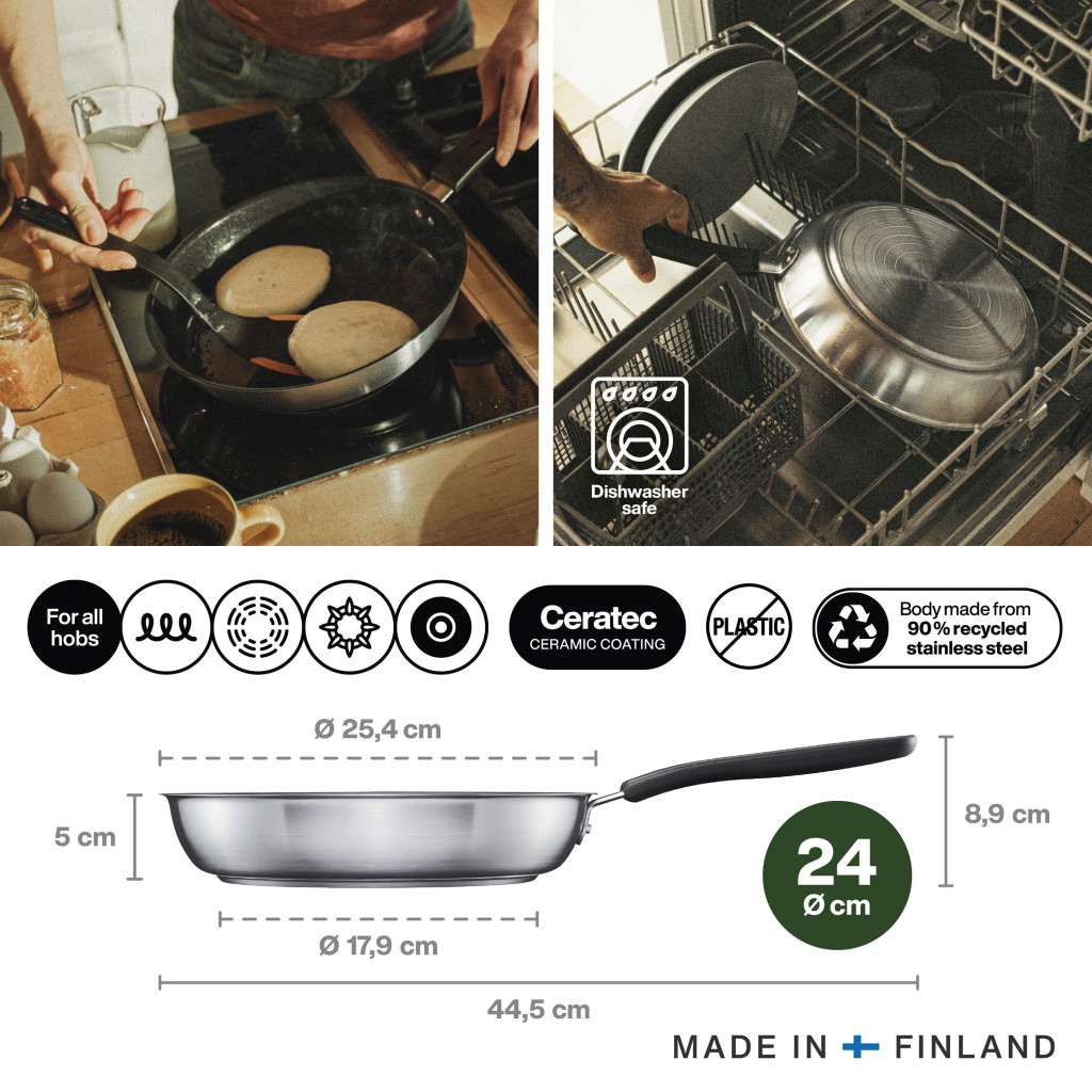 A Fiskars Functional Form™ serpenyő, 24 cm-es méretével és kerámia bevonatával ideális választás a mindennapi főzéshez. Különösen alkalmas tojás, zöldség, hal és hús sütésére, és könnyen tisztítható, mosogatógépben is mosható. A serpenyő teste 90%-ban újrahasznosított rozsdamentes acélból készül, ami garantálja a tartósságot és a környezetbarát megoldást.