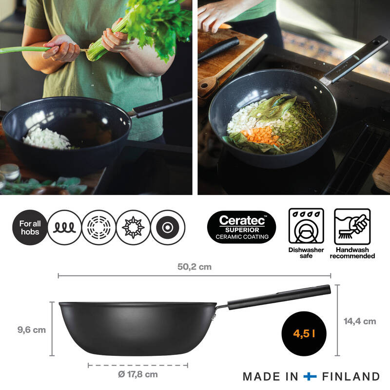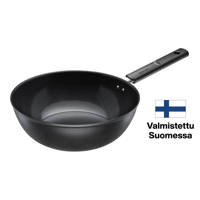 A Fiskars Hard Face 28 cm-es wok serpenyő tökéletes választás nagyobb adagok sütéséhez és pirításához. A finn gyártású, műanyagmentes és tapadásmentes Ceratec™ Superior bevonat gondtalan főzést tesz lehetővé, miközben gyönyörűen pirítja az ételeket. A vastag aljú, 100%-ban újrahasznosított alumíniumból készült serpenyő minden tűzhelytípuson hatékonyan működik.