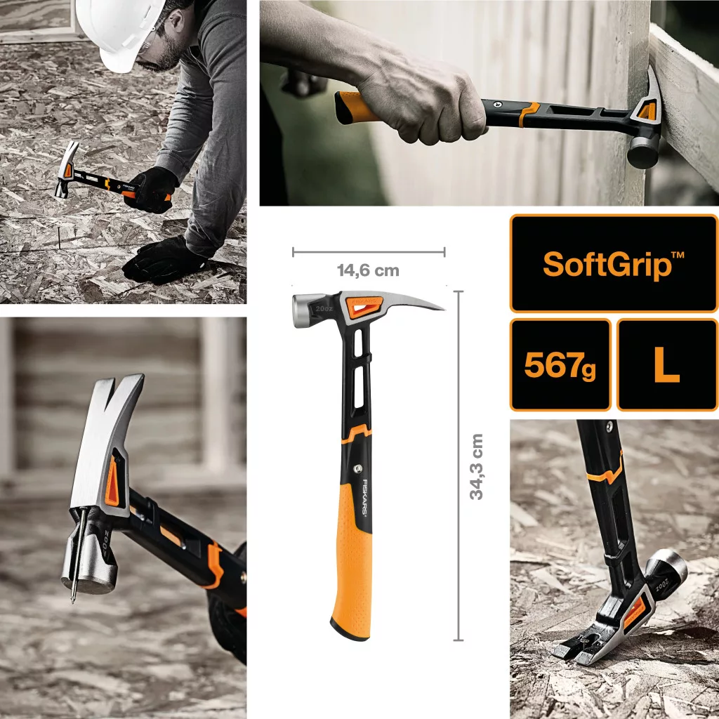 A Fiskars IsoCore™ általános kalapács L (1020214) egyedülálló rezgéscsillapító rendszerrel rendelkezik, amely akár 70%-kal csökkenti a rezgéseket, ezzel minimalizálva a sérülések és a kényelmetlen munkavégzés lehetőségét. Az ergonomikusan kialakított markolat és a szegbeverő előkészítés lehetővé teszi az egykezes felhasználást, míg a karmok a szegek kihúzását és leszerelését segítik. Ez a kalapács maximális teljesítményt nyújt minimális kellemetlenséggel.