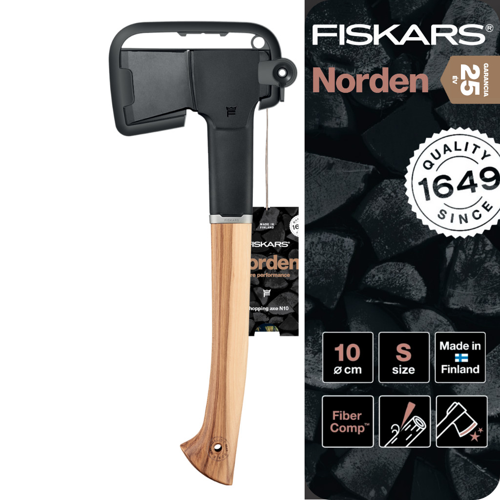 A Fiskars Norden ácsfejsze N10 egy kiváló példája az északi fejszekészítési hagyományoknak, amely ideális fa aprítására és gyújtás készítésére. A fejsze egykezes használatra tervezett, 35,5 cm hosszú nyele kiváló minőségű hickory fából készült, és rendelkezik egy új FiberComp™ gallérral, amely megvédi a tengelyt a túlterheléstől. A fejsze pengeje kiváló minőségű szénacélból készült, súrlódáscsökkentő bevonattal, ami megakadályozza a penge beragadását és megvédi a rozsdától.