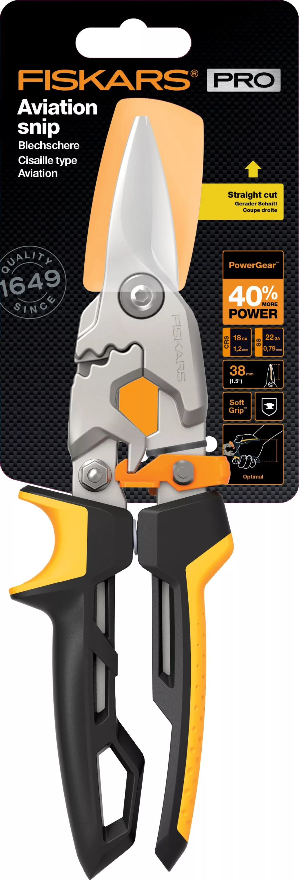 A Fiskars PowerGear™ egyenes lemezolló olyan helyzetekre készült, ahol a pontos, erőkifejtés nélküli vágás napi szinten elvárás. A PowerGear™ nyomatéknövelő mechanizmus 40%-kal nagyobb vágóerőt biztosít, különösen nagy ellenállású anyagok vágása során. Alkalmas HVAC csövekhez, fémlemezhez, gipszkartonhoz, külső burkolatokhoz, tetőfedéshez és ipari szerelési feladatokhoz.
