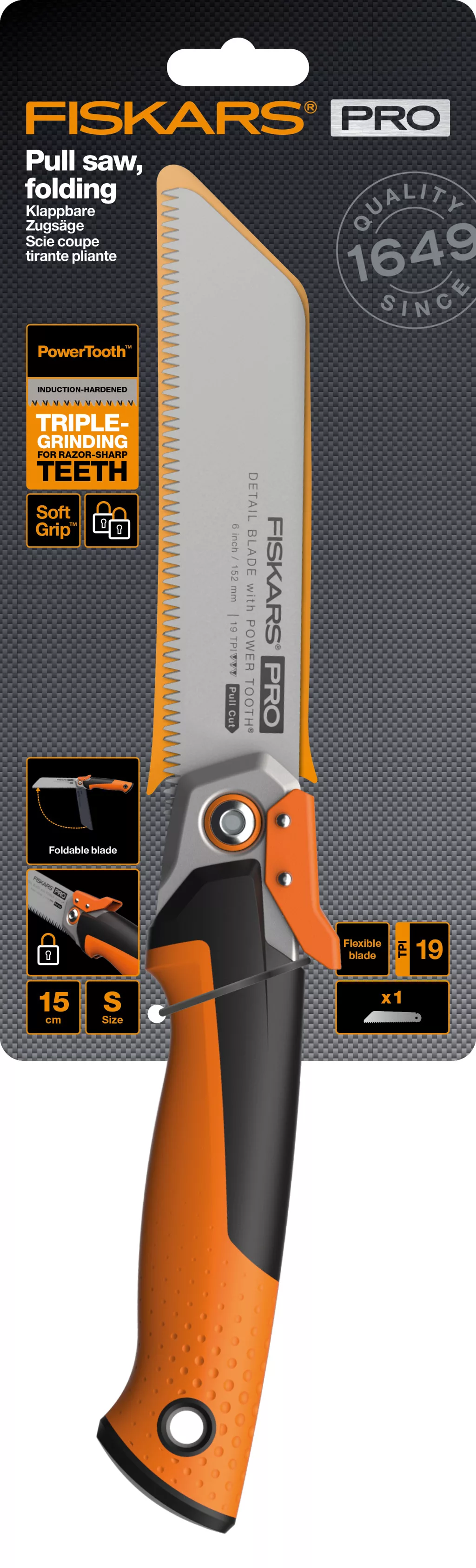 A Fiskars PowerTooth™ összecsukható fűrész ideális választás azoknak, akik pontos és biztonságos fűrészelést igényelnek. Ez a fűrész a teljes méretének a felére összecsukható, így a penge védve van és a használat biztonságos, anélkül, hogy a teljesítményben kompromisszumot kellene kötni. A biztonságos rögzítő mechanizmus megakadályozza a penge véletlen kinyílását, míg az ergonomikus markolat SoftGrip bevonata innovatív mintázattal rendelkezik, amely elvezeti a nedvességet és biztos fogást garantál.