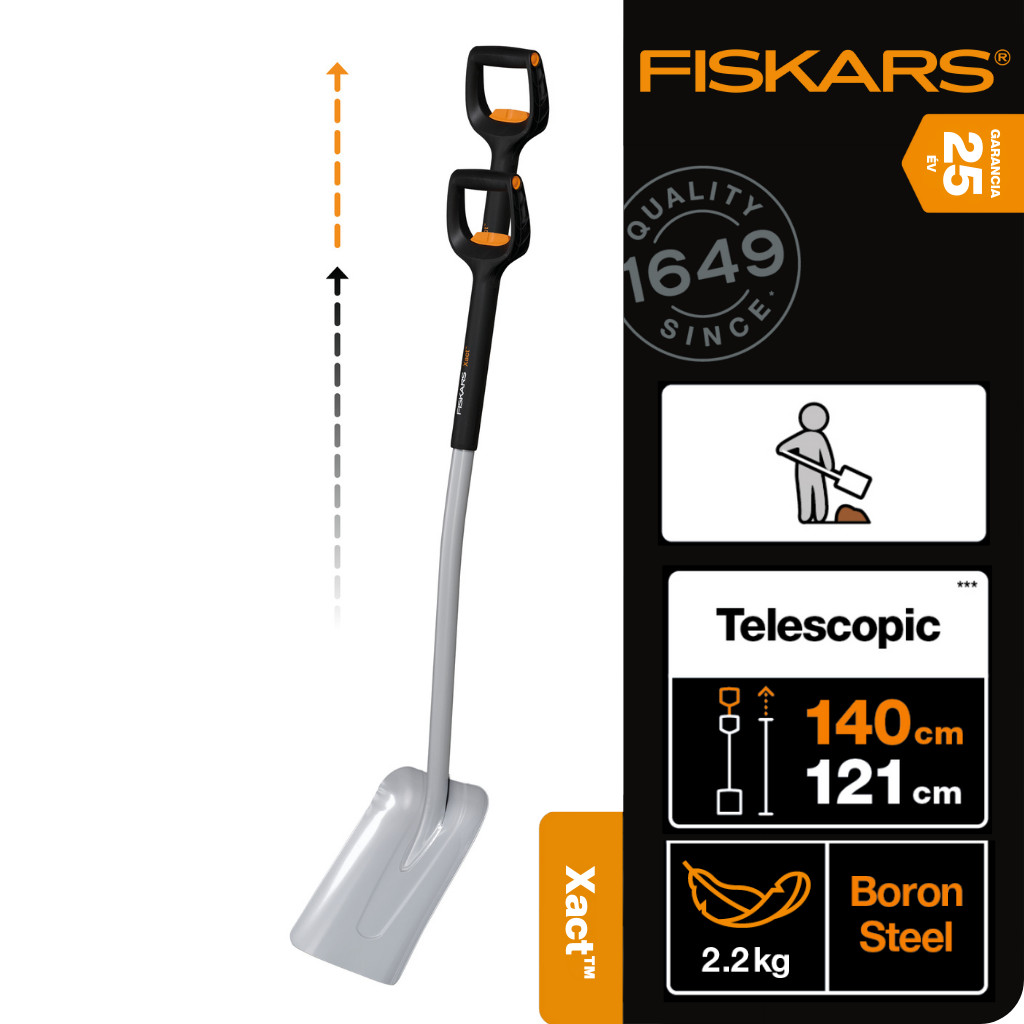 A Fiskars Xact™ Teleszkópos lapát egy innovatív eszköz, amely segít a hatékony munkavégzésben, kevesebb erőfeszítéssel. Ideális föld, homok, kavics és egyéb anyagok mozgatásához, mivel széles kontúrú feje megkönnyíti az anyagkezelést, csökkentve a gerinc terhelését. A bóracél fej egy kompozit acél tengelyre van hegesztve a maximális tartósság érdekében.